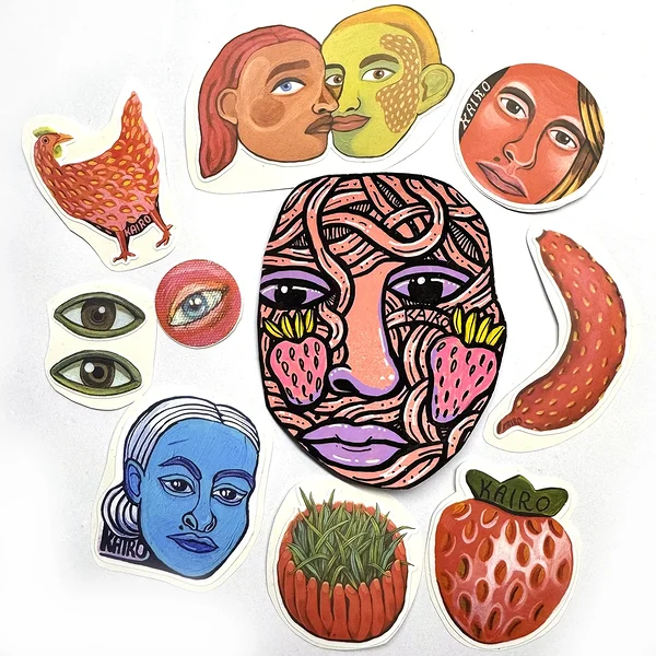 10 kleepsu kunstnikult KAIRO. Üks käsitsi maalitud ja lakitud kleeps, mis on igas pakis erinev. Teised 9 trükitud digitrükis ning lamineeritud, et kaua vastu peaksid.