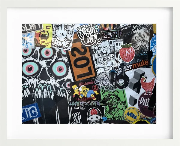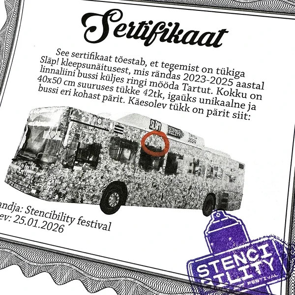 Tükike kleepsunäitusest, mis rändas 2 ja pool aastat linnaliini bussi küljes ringi mööda Tartut. Kaasas sertifikaat, mis tõestab teose originaalsust ja joonis, mis näitab täpselt, millisest kohast bussi pealt tükk on pärit.